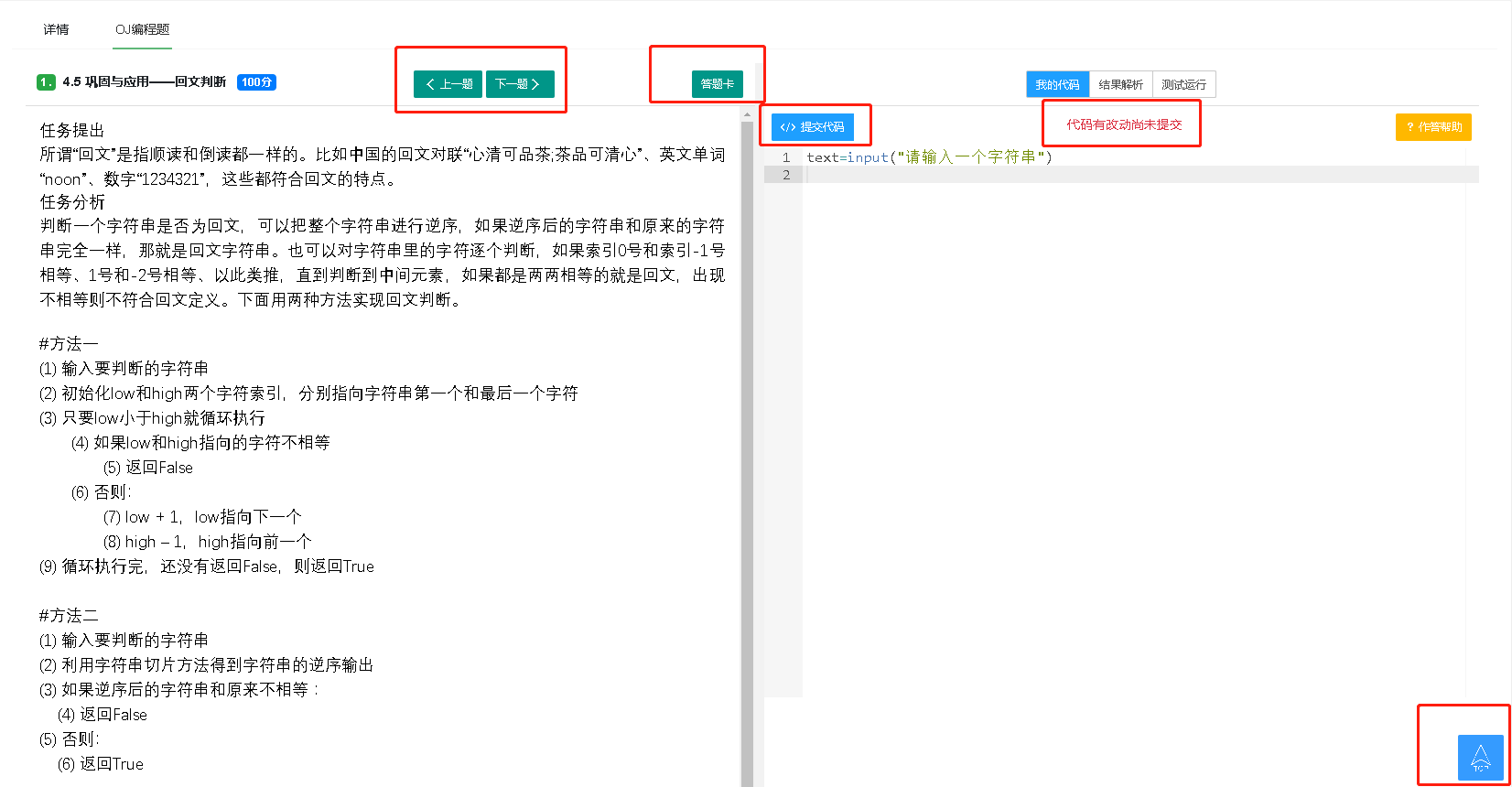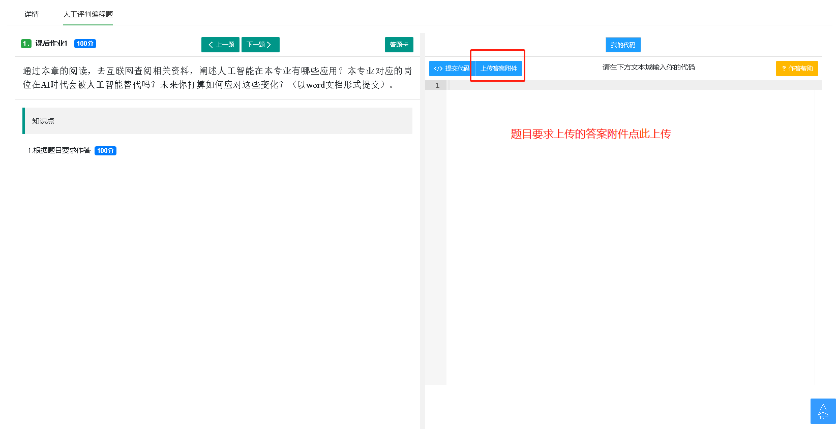 题目要求的代码在代码区域作答,题目如果有要求上传其他类型的附件,请点击上传答案附件。